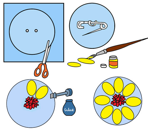 A sheet of thick cardpaper, any strong glue, pumpkin seeds, peppercorns, yellow paint, a pencil, a pair of scissors, a small piece of thread and a safety pin.