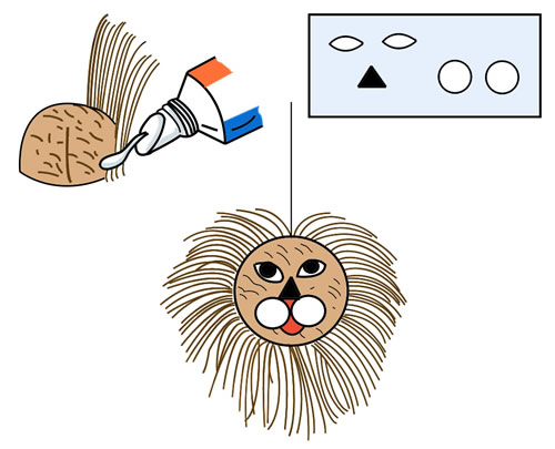 You will Need: A betelnut (supari) sliced in half; some coconut fibres, cardpaper, marking pen, a piece of twine, scissors and glue. How to Make: Cut out the shapes of the eyes, nose, and mouth from the cardpaper and keep aside. Paste the coconut fibres around the outer edge of the betelnut to form the mane of the monster. Paste the eyes, nose and mouth to form the face. Fix a piece of twine to the nut with glue if you wish to swing your supari monster.