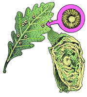 When the larvae hatch, they begin feeding on the leaf tissue surrounding them. The tree defends itself by growing a tough mass of tissue around the larva,which is called a gall.