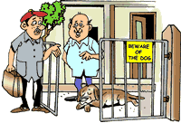 The plumber asked the owner, "Is that the dog that you have warned against?"