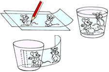 A glass, cellophane paper, a cut-out of a comical strip, cello tape and a sparkling sketch pen.