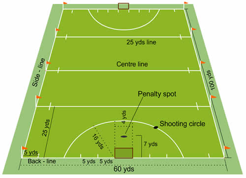 A grass or synthetic pitch, rectangular, with a length of 100 yards (91.4 m) and a width of 60 yards (55 m), Flag posts of between 4 and 5 ft high (1.2-1.5 m) are placed at each 25 yards line (22.9 m), 1 yard outside the sidelines and at each corner of the field.